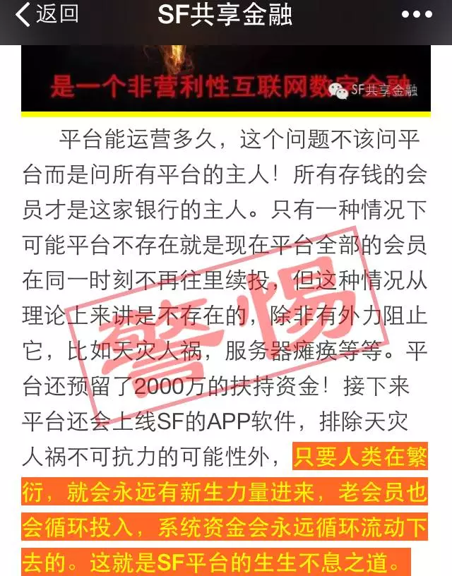 那么,这个平台能运营多久?“SF共享金融”公众号文章表示,“这个问题不该问平台而是要问所有平台的主人!所有存钱的会员才是这家银行的主人。”文章表示,“只有一种情况下可能平台不存在,就是,现在平台全部的会员在同一时刻不再往里续投”,此外,该平台还宣称预留了2000万的扶持资金。