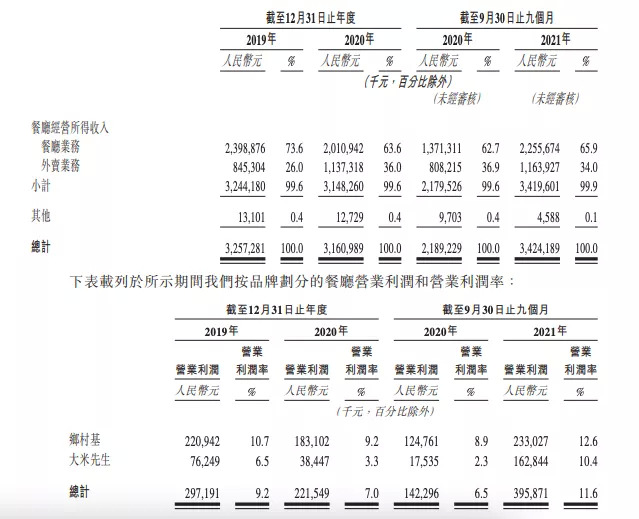 招股书显示,乡村基2019年、2020年及截至2021年9月30日止九个月,收入分别为人民币32.57亿元、31.61亿元及人民币34.24亿元,其中大部分的收入源于餐厅经营,包括餐厅业务和外卖业务。净利润方面,截至2021年9月30日止的9个月,乡村基净利润达1.63亿元,2020年同期为亏损,达1380万元。