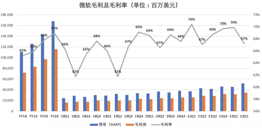 财报显示,2022财年Q2微软毛利347.68亿美元,同比增长20%;毛利率为67%,与上年同期持平,较前两个季度的70%,小幅下滑。
