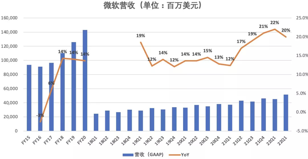 数据显示,2022财年Q2,微软实现517.28亿美元的总营收,同比增长20%,不计入汇率变动的影响为同比增长20%,这一业绩也超出分析师预期。
