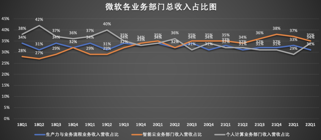 其中,生产力和业务流程部门营收159.36亿美元,同比增长19%,为微软贡献了31%的营收。