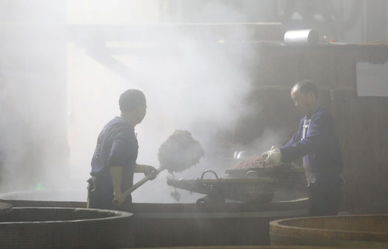 早上8点,驴溪酒厂已然是一派忙碌的景象,古朴的车间内,十几位工人熟练地翻晾着还未蒸煮的粮食,大口径蒸锅烟雾缭绕,几位老师傅对着光仔细检查着高粮蒸煮的情况……