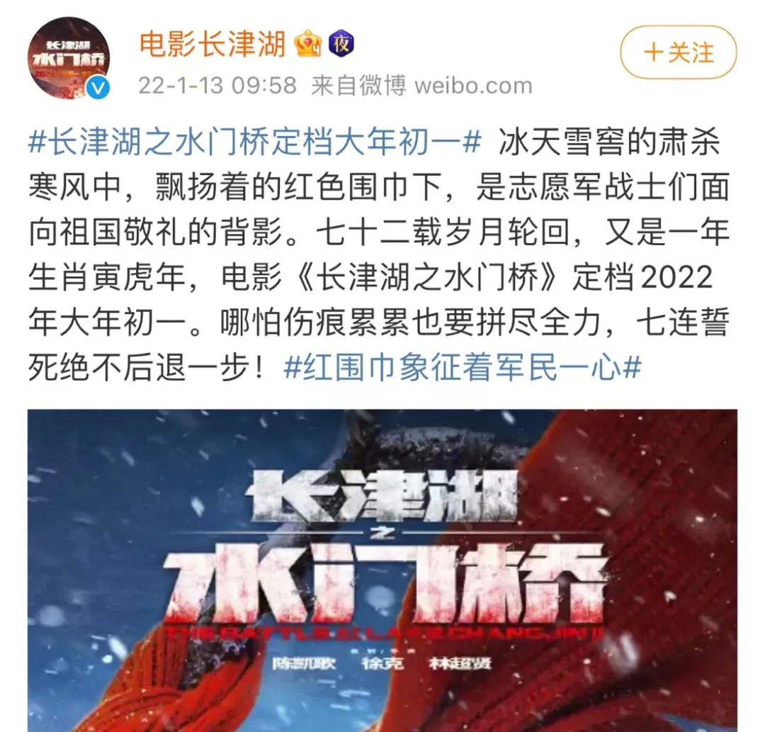 《水门桥》官方宣布定档大年初一,图源长津湖官方微博