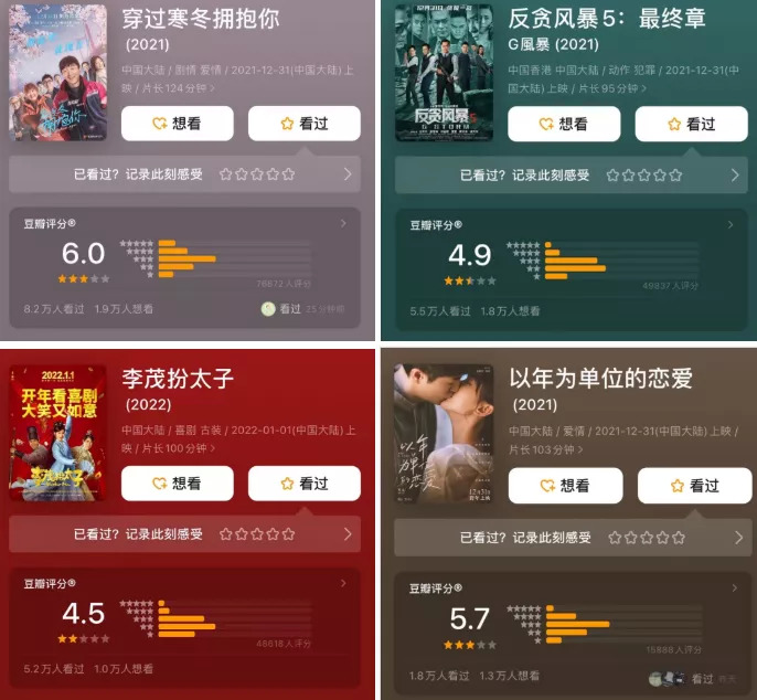 据灯塔专业版数据,截至1月3日21时30分,2022元旦档总票房(含预售)达10.1亿元,总人次2437.5万人,总场次135.8万场,票房数据明显不如去年12.99亿。其中,元旦档新上映的影片《穿过寒冬拥抱你》《反贪风暴5:最终章》《李茂扮太子》《以年为单位的恋爱》均口碑不高,豆瓣评分基本在4.5分-6分。