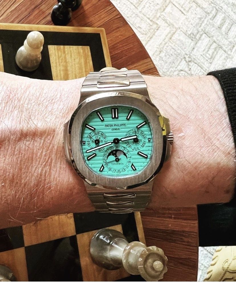 仔细观察会发现,这枚腕表是蒂芙尼与百达翡丽的合作表款,而整个外观设计正是借鉴了百达翡丽鹦鹉螺系列万年历(Nautilus Perpetual)不锈钢表款的设计,同时使用了蒂芙尼经典的“罗宾鸟蛋蓝”来装饰表盘。据说这枚腕表是蒂芙尼与百达翡丽为这位全球顶级富豪特别定制的,仅此一枚。