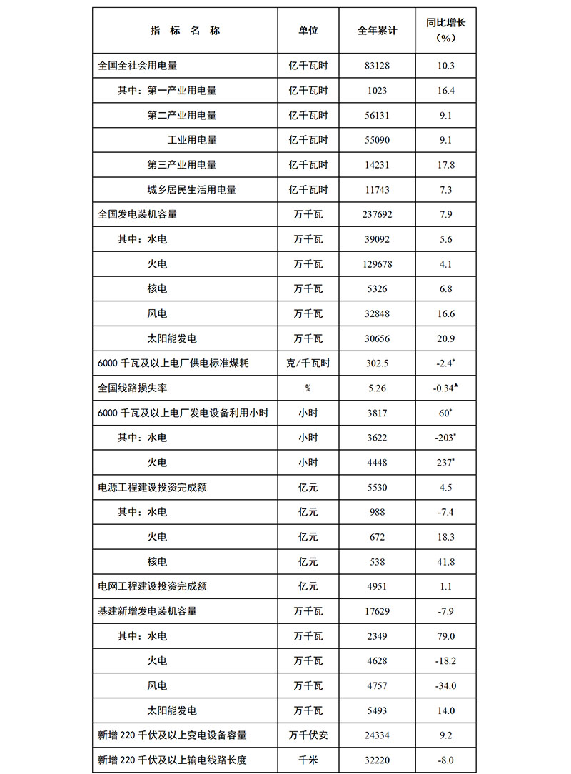 注:1.全社会用电量为全口径数据,全国供电量为调度口径数据。2.“同比增长”列中,标*的指标为绝对量;标▲的指标为百分点。