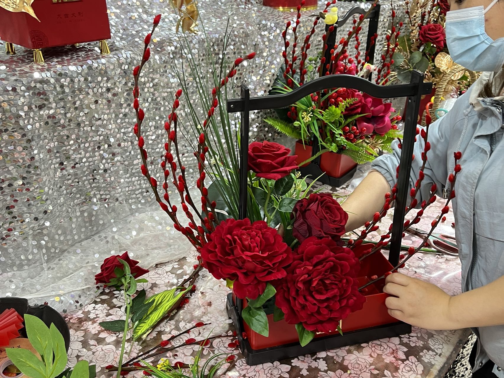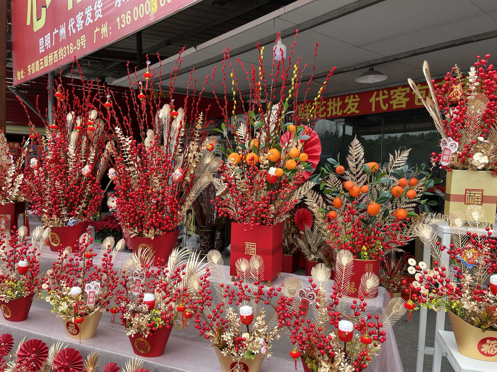 “福桶”被他们视作是今年年宵花的爆款,在岭南花卉市场几乎每个档口最明显位置都能找到它的身影,采用新鲜红色银柳与干花、干叶(多为金色)进行搭配,有的加入了吉祥物或公仔,有的则走国风路线,价格从38元到220元不等。