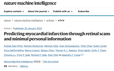 智东西1月26日消息,本周二,英国利兹大学研究小组的一项新成果登上国际学术顶刊Nature的子刊Nature Machine Intelligence。研究人员开发了一种AI(人工智能)系统,该系统通过深度学习算法来训练,可以分析视网膜扫描图像中的心脏病发作迹象,识别准确率在70%-80%之间。