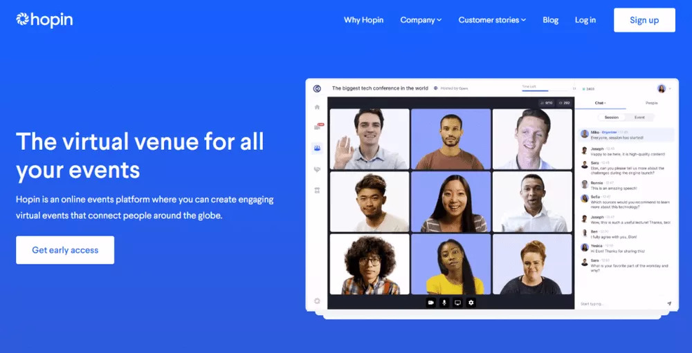 Hopin是一家英国的线上活动公司,成立于2019年。组织者只需几分钟,就可以在线上创建、举办和管理多达100000人的现场活动,包括线上聚会、内部会议、线上马拉松等。Hopin疫情期间得到了迅猛发展,共吸引了1.25亿美元的融资,目前估值高达21亿美元。