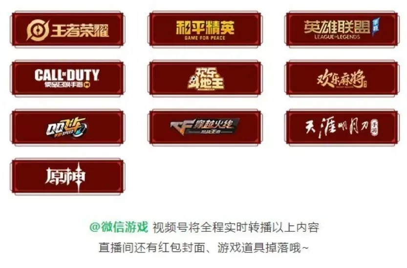 除了几大直播平台,微信之前也宣布会在视频号独家进行“游戏春晚”,连续4天10款游戏进行直播拜年,“新春会”、“拜年祭”、“游戏春晚”等节目从二次元游戏向更多品类辐射,涉及《明日方舟》《坎公骑冠剑》《原神》《崩坏3》《永劫无间》《第五人格》《阴阳师》《使命召唤》《王者荣耀》《穿越火线》《和平精英》《英雄联盟手游》《天涯明月刀手游》《最终幻想14》等多款游戏。
