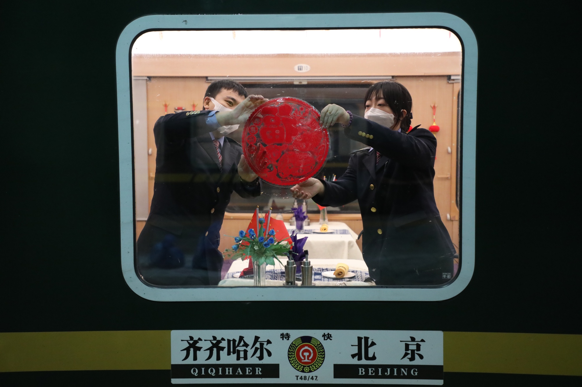 列车员在车窗贴上福字。(央广网发 哈尔滨铁路局 供图)