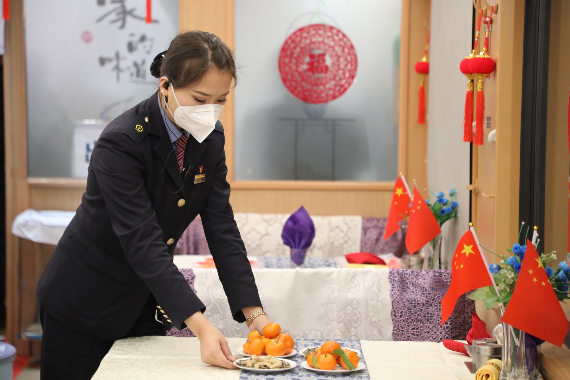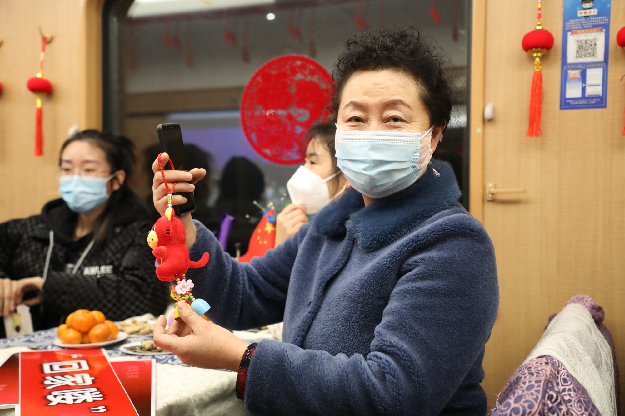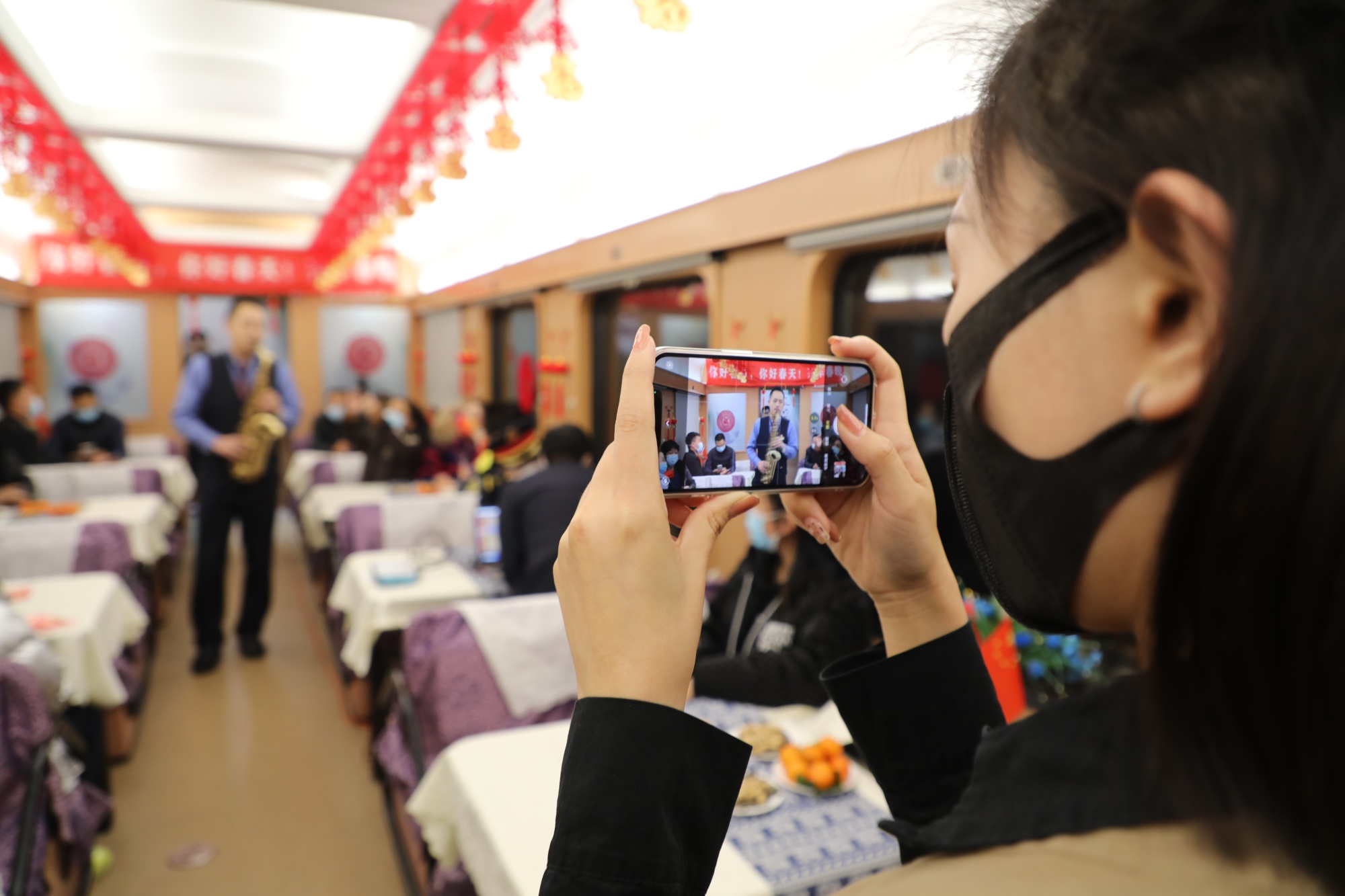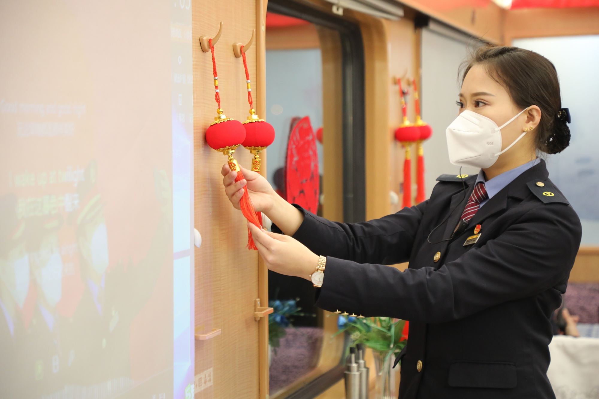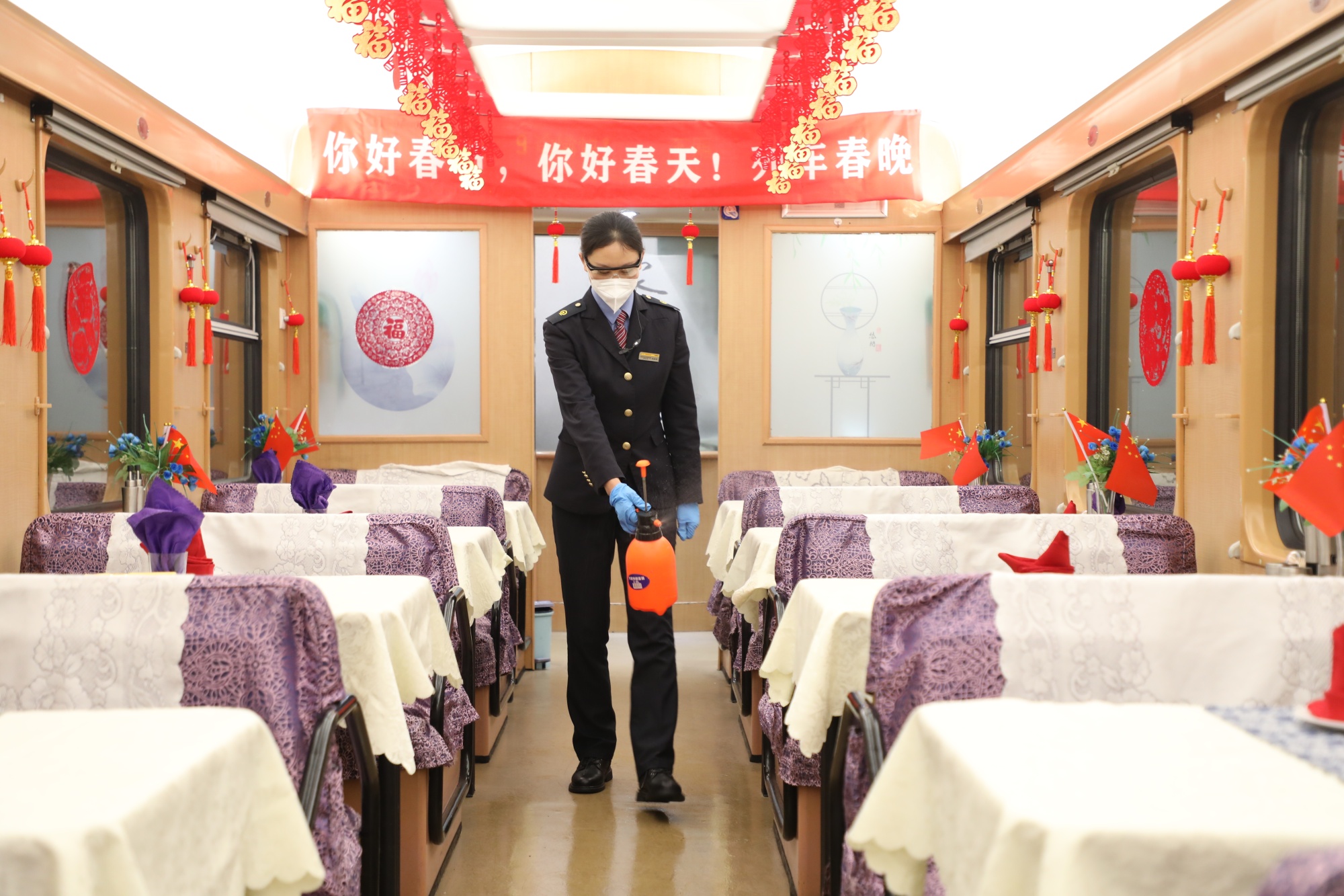 车厢里,五彩缤纷的新年装饰品格外鲜丽,悬挂的福字拉花和小红灯笼为列车增添了几分过年的气息。
