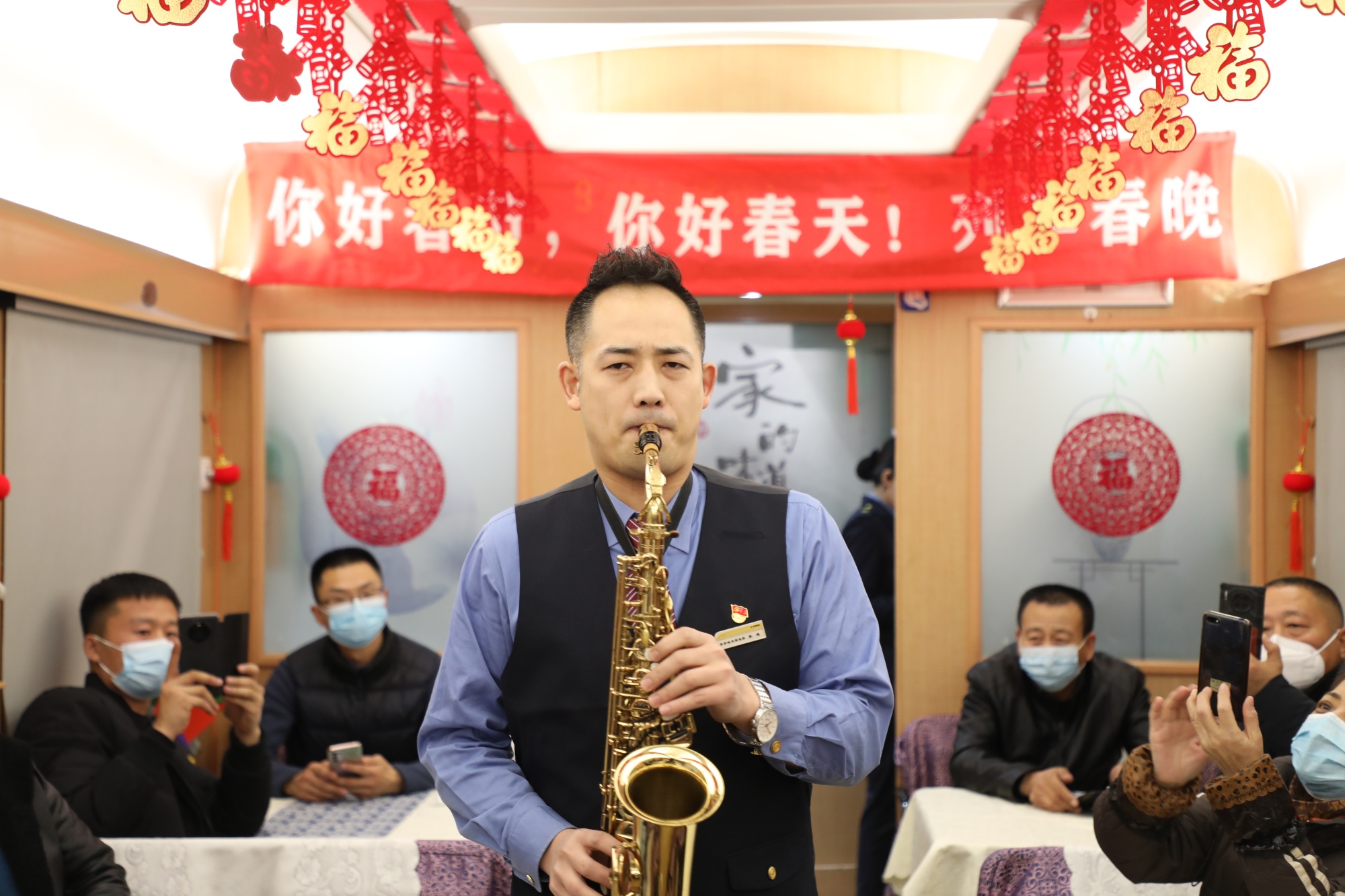 随后,一首萨克斯独奏将活动推向高潮,旅客们伴随着乐曲打起节拍,津津有味地欣赏节目,有的旅客还与乘务人员一同演唱,车厢瞬间变成了欢乐的海洋。乘务员们的精彩表演点燃了旅客的热情,他们纷纷拿出手机拍照,记录下这精彩的瞬间。