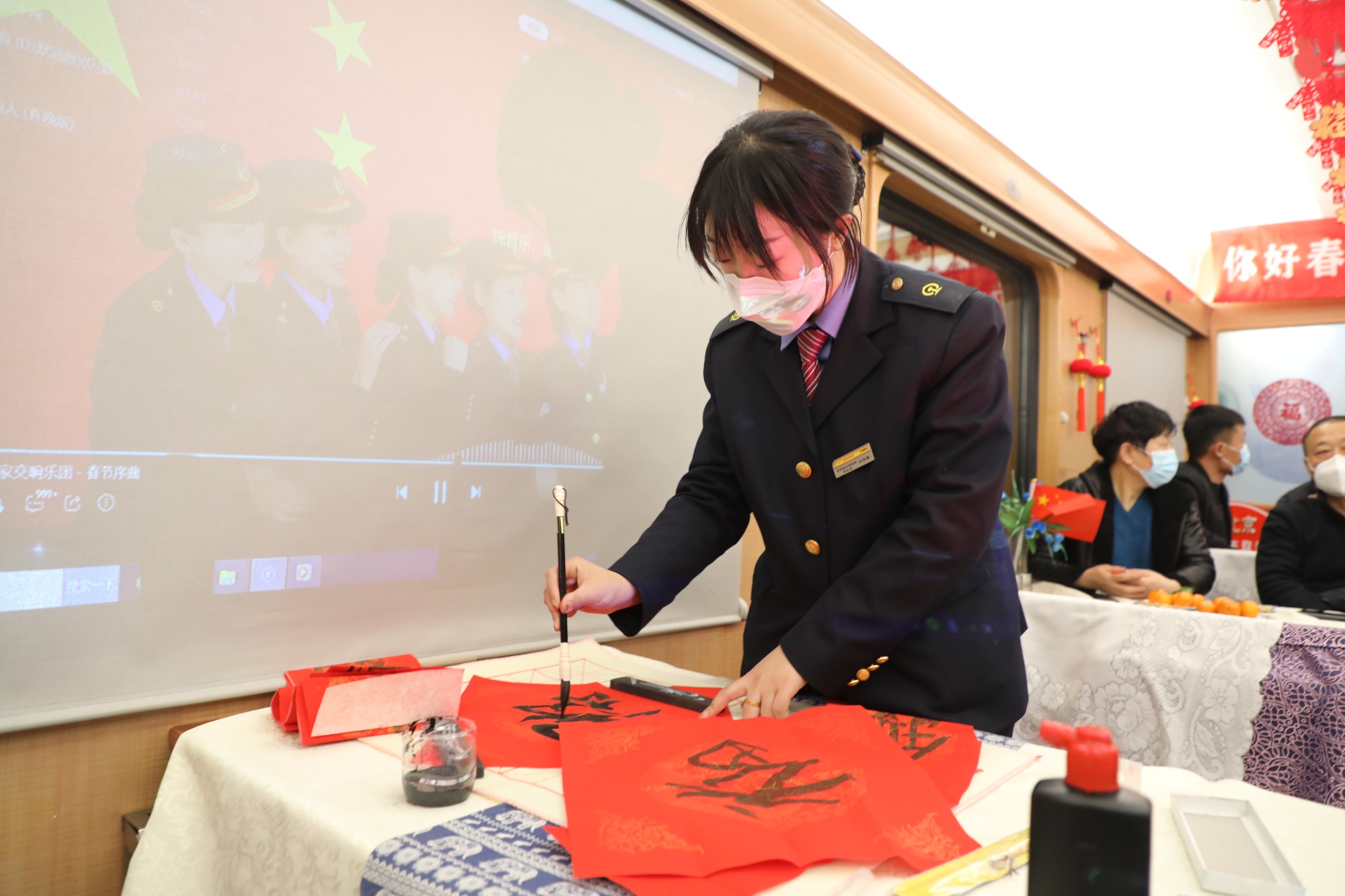 列车员写书法“福”字。(央广网发 哈尔滨铁路局 供图)