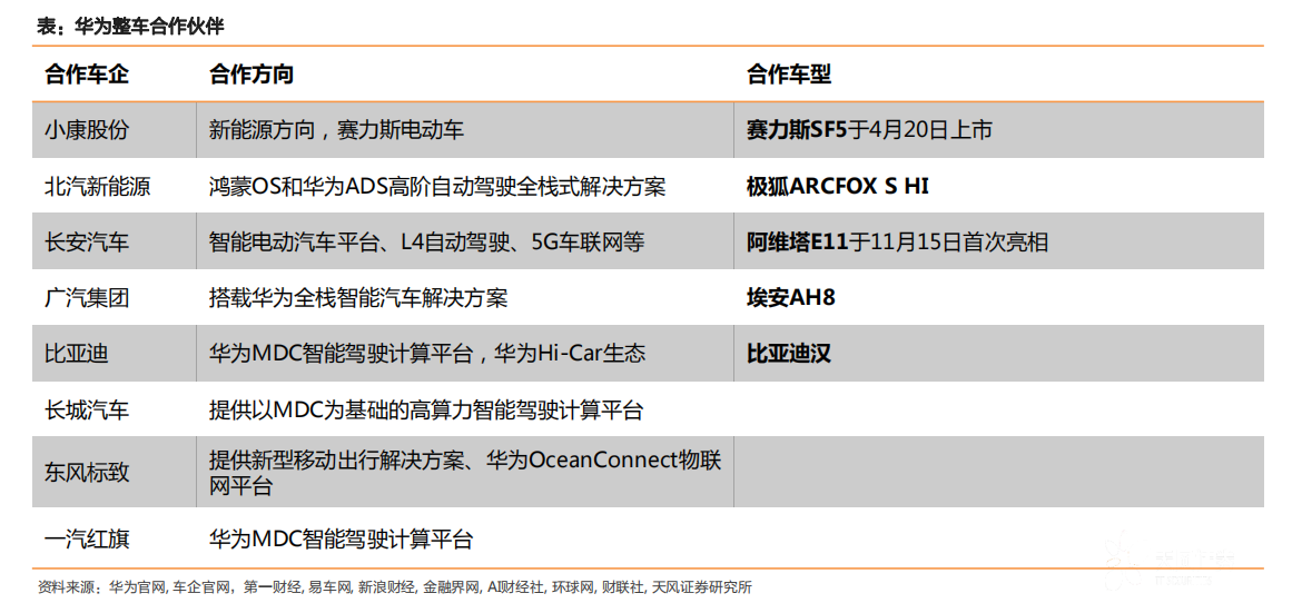 第三,华为以零部件供应商的公司角色,向车企或以及供应商提供智能汽车零部件。在这一层面,华为主要的合作伙伴更偏向产业链上游。