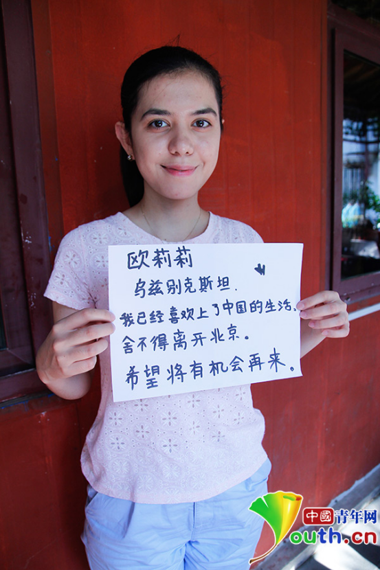 “我已经喜欢上了(在)中国的生活,舍不得离开北京。希望有机会再来。”欧莉莉是金国维在塔什干时的同班同学,也因成绩优异获得中国政府的奖学金,在北京语言大学做交换生,主修中文。