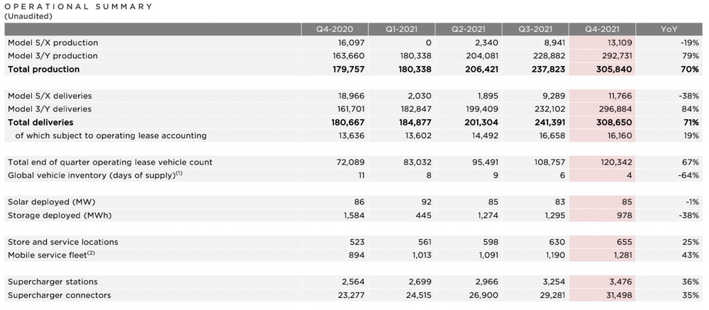 在工厂产能方面,特斯拉认为2021年第四季度受到了全球供应链、运输、劳动力和其他制造业方面的影响,最终限制了特斯拉满负荷运营工厂的能力。