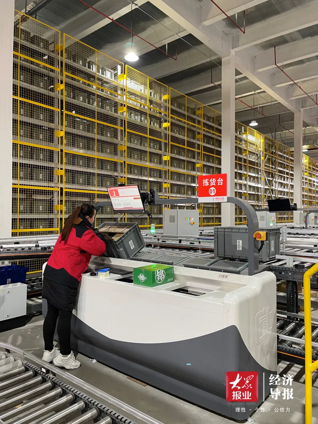 “像我们现在仓库自动化程度较高,进出库效率也就很高,10个人就可以解决一天2万到3万单的发货量。如果是传统的仓储来做,可能大约需要40人,甚至50个人。”1月20日,站在京东(平邑)数智物流产业园1号仓内,京东(平邑)数智物流产业园业务负责人赵泰春向经济导报记者介绍,通过自动化输入线和自动化的工作机解决以前人找货的困难,实现了货找人的功能。