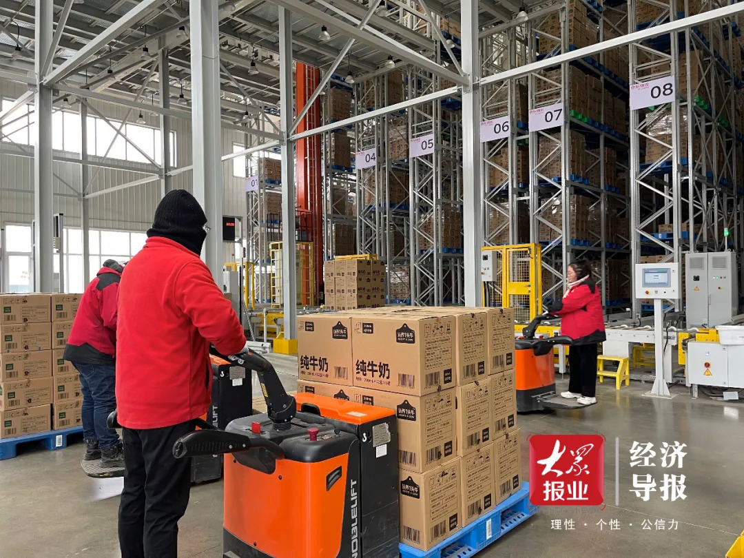 以合作项目“认养一头牛”为例,目前该品牌平邑自营工厂生产的奶制品直接运送至这里入库,平邑京东云仓辐射该品牌在全国的近10个分仓,同时包括线下所有商超仓库。从2021年10月合作运行至今,经测算,平邑京东云仓可为“认养一头牛”品牌节省资金数百万元。