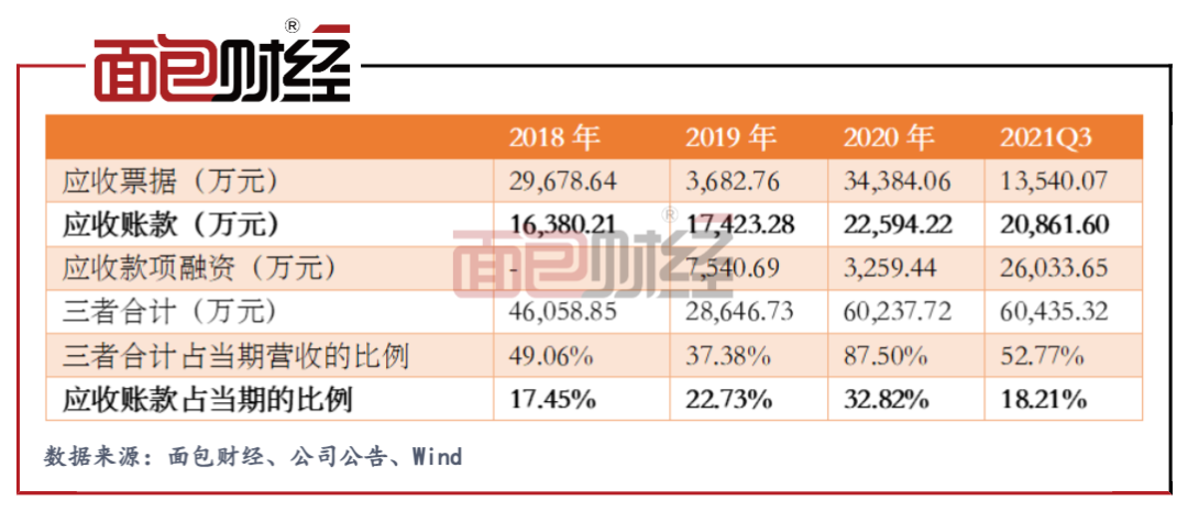 整体而言,2020年至2021年前三季度,湖北万润应收票据、应收款项融资和应收账款合计占营收的比例较往年明显上升。