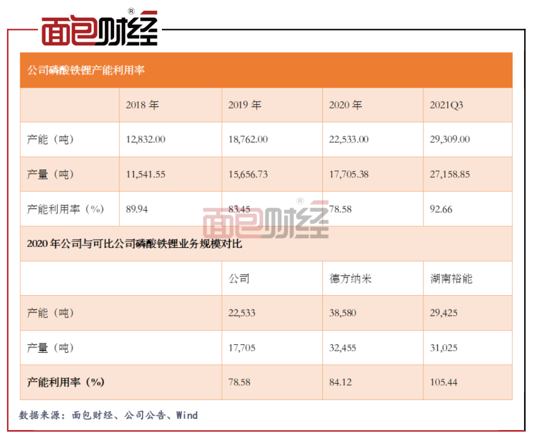 在湖北万润主营的磷酸铁锂正极材料业务方面,其产能和产量均不及主要同行竞争者德方纳米和湖南裕能。至2021年前三季度,公司磷酸铁锂产品的产能利用率为92.66%,较2020年增加14.08个百分点,但仍未达满产。2020年公司的产能利用率低于同行公司。