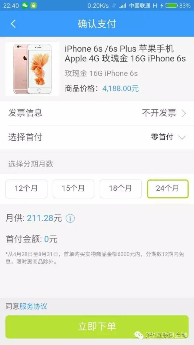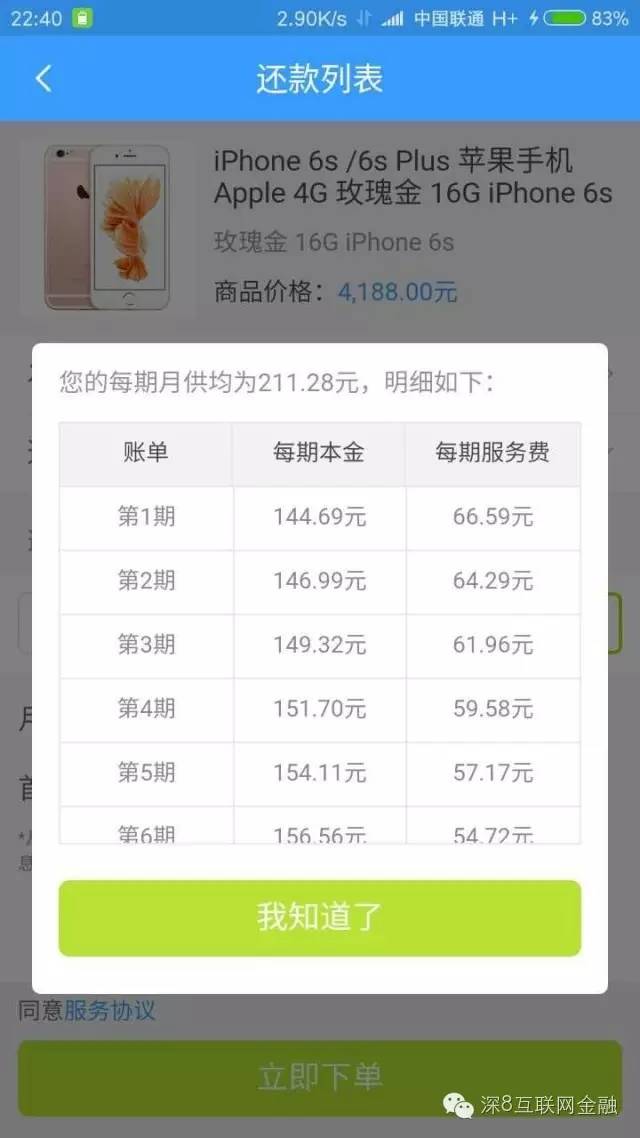 当然,对于年轻气盛的、对世界充满好奇的、依然需要家里养活的大学生来说,月供211.28元,似乎也在承受范围内,而且可以提前消费,立即拿到玫瑰金的iphone 6s,何乐而不为呢? 可是,假设一个大学生每月的生活费是1000元,单是一笔取现月供和手机分期月供,就要花费362元,占了一个月生活费的近四成;如再遇到其他突发事故,比如生病、过生日请吃饭,哪怕是请女孩子看个电影等,都可能导致“入不敷出”。