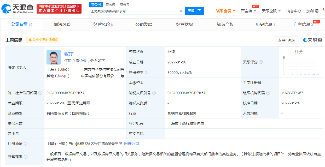 天眼查App显示,1月26日,上海数据交易所有限公司完成工商注册,其法定代表人为张琦,注册资本8亿人民币,经营范围包括数据商品交易,以及数据商品交易的相关服务等。股东信息显示,该公司由上海数据交易中心有限公司、上海市信息投资股份有限公司、上海联合产权交易所有限公司等共同持股。2021年11月25日,上海数据交易所揭牌成立仪式在沪举行并达成了部分首单交易。
