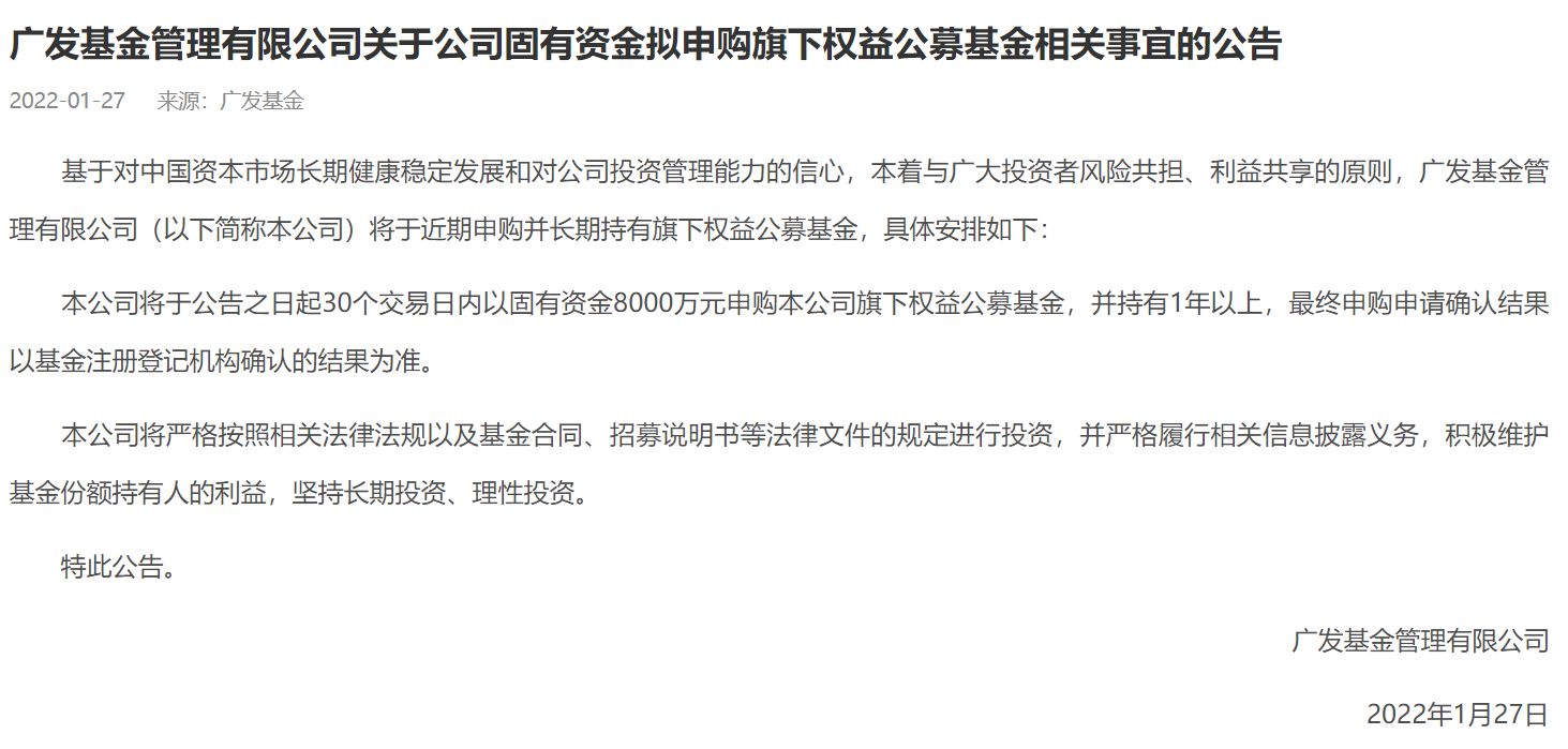 今日,广发基金发布公告,称基于对中国资本市场长期健康稳定发展和对公司投资管理能力的信心,本着与广大投资者风险共担、利益共享的原则,公司将于公告之日起30个交易日内,以固有资金8000万元申购本公司旗下权益公募基金,并持有1年以上。