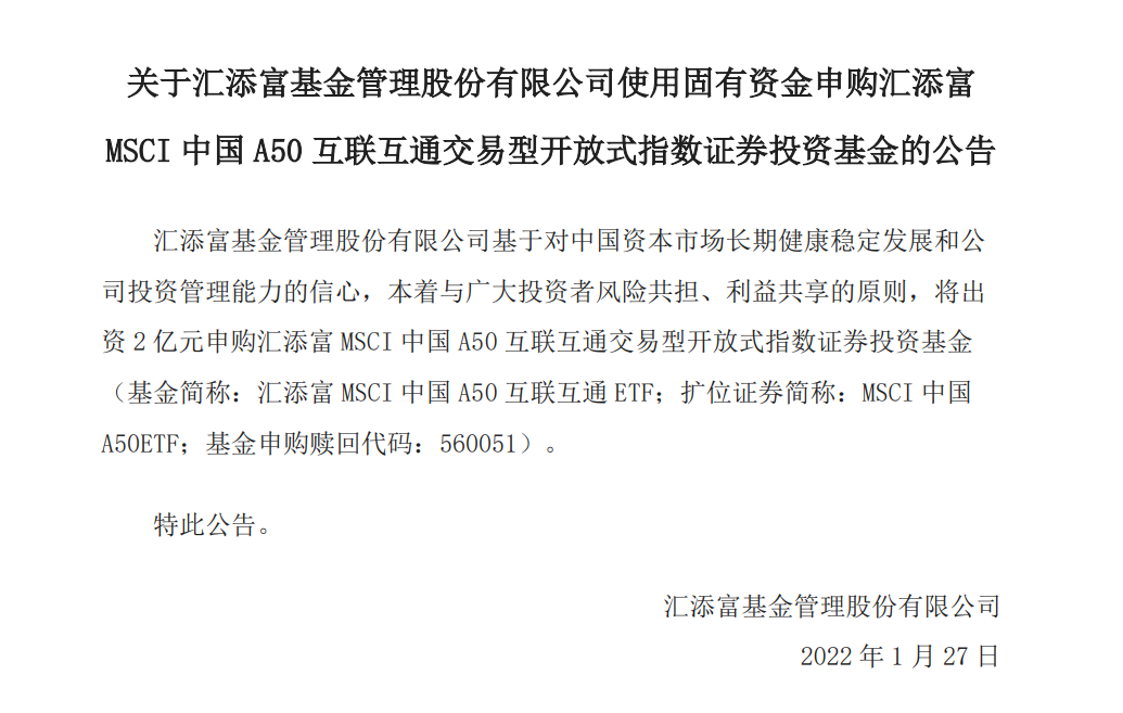 今日,汇添富基金公告称,基于对中国资本市场长期健康稳定发展以及公司投资管理能力的信心,本着与广大投资者风险共担、利益共享的原则,公司运用自有资金2亿元申购MSCI中国A50ETF,并承诺持有时间不少于1年。