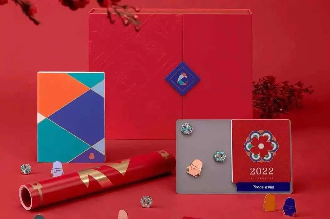 除此之外,腾讯的新年礼盒也极富创意。礼盒主体设计以敦煌为灵感,充满中国风的红色系包装,配上了“腾讯蓝”色的卡扣。打开之后,能看到珐琅工艺的两只圆形磁贴和一只企鹅磁贴,另外就是新年礼盒标配——10个印有珐琅企鹅的红包、一本要自己组装的台历,以及一副对联。