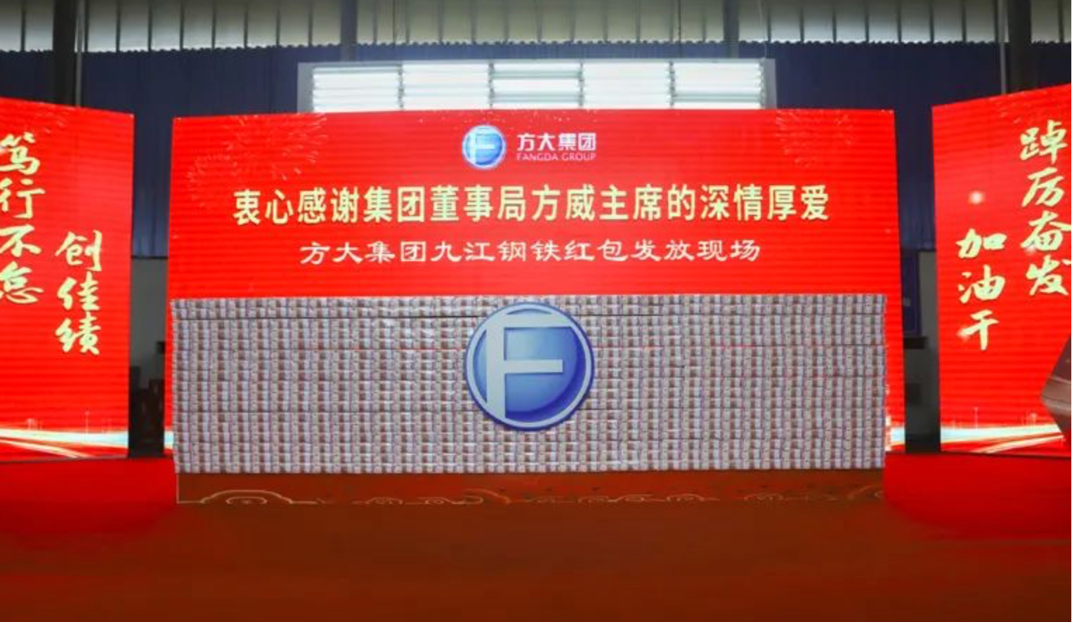 1月27日,据方大集团官微消息,方大九江钢铁在现场垒起现金墙,给每位员工发放2万元红包和2000元“孝敬父母”红包,红包金额共计1.25亿元。