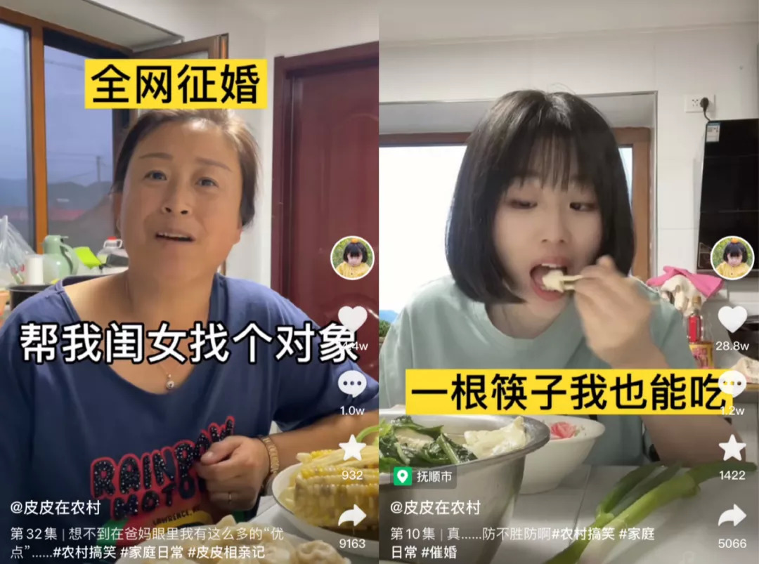 据开菠萝财经总结,分为儿女出镜被催婚和父母出镜催婚等两大类型。“云吞它爹”、“皮皮在农村”俨然成了最受关注的“单身狗”,他们每天被几百万人围观父母催婚,也会被粉丝点“鸳鸯谱”。“越文阿姨”则成为了全网“最不择手段”的“催婚”妈妈,在她的短视频里,每一个进她家门的人,都会被她和自己的儿女“配对”。