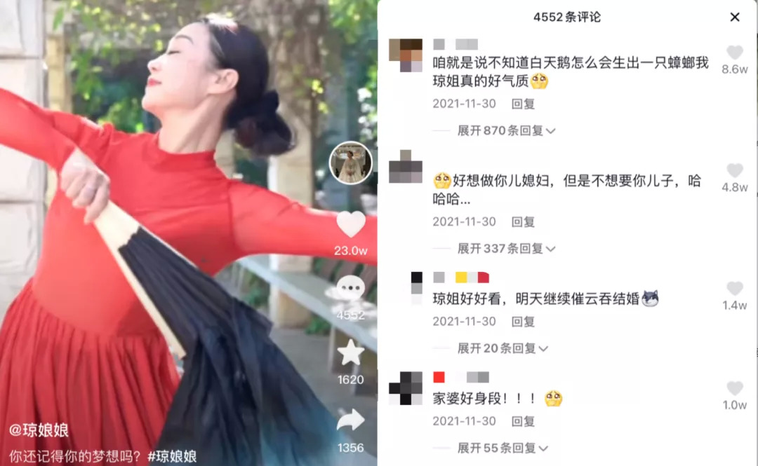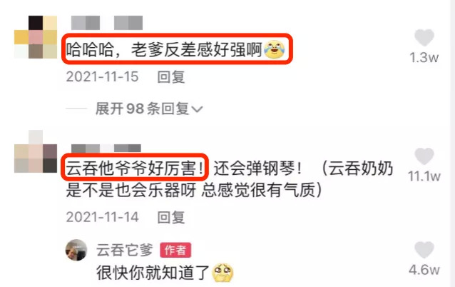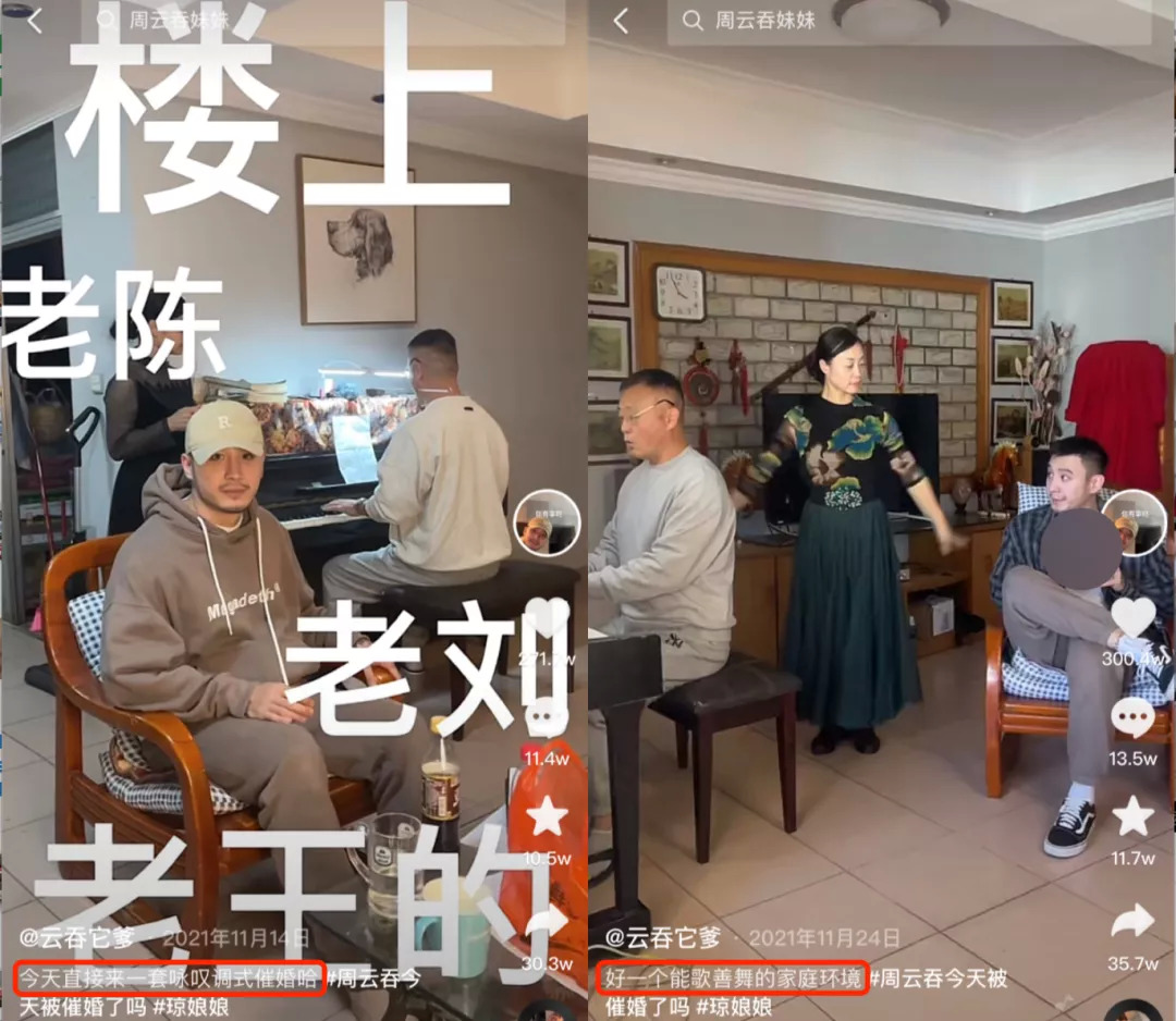 “云吞它爹”早早地就开始铺垫,在评论区让用户猜测自己爸妈的职业,随后“应粉丝呼声”,拍摄了展示父母才艺的单独系列视频,点明爸爸妈妈的职业。此后,周妈妈开设了抖音账号“琼娘娘”。该账号仅发布了一条视频就获得了近10万粉丝。