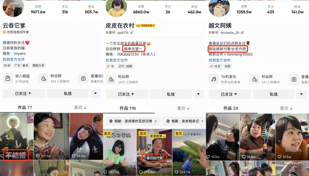 他们也观察到,这些催婚账号,为了应对一茬接一茬的流量密码切换,正在试图通过搭建账号矩阵、拓展拍摄内容进行突围,人为拉长生命周期。