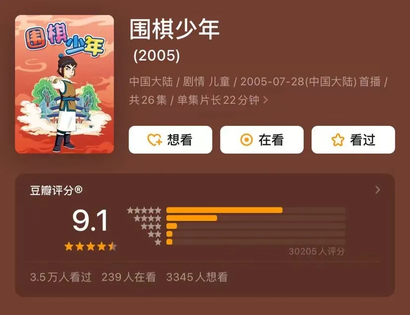很多观众缺少对“第二季”的印象,2009年的《围棋少年2》由于人设变化和剧情质量滑坡,并未取得较大影响力,即便如此也在豆瓣得到了8.2的高分。而那部讲述江流儿从零学棋、最后击败东瀛宿敌的“童年神作”,已被追评到9.1,和《虹猫蓝兔七侠传》《大英雄狄青》《我为歌狂》等作品一起沉淀为一代人心中的经典动画IP。