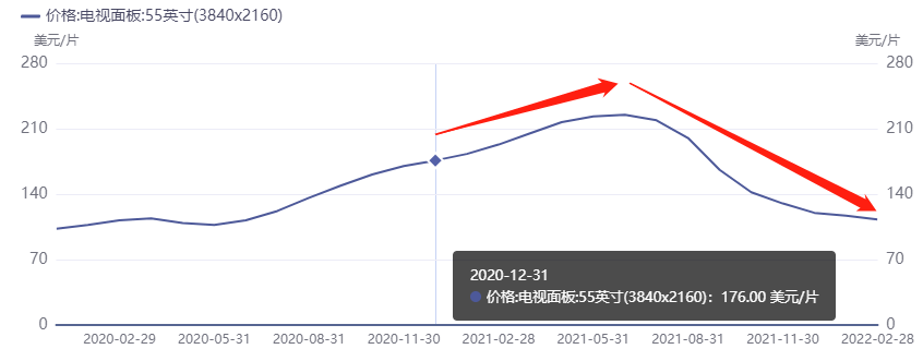 以55寸面板为例。iFind数据显示,2020年初以来55寸面板价格持续上涨,并于2021年6月末触及225美元/片的高点,为近六年新高。随后面板价格震荡下行。