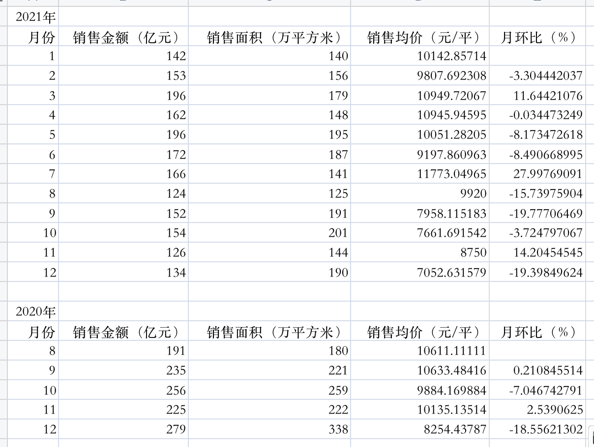 是否每逢年底,金科股份在售价上都有下降冲业务的“惯例”呢?至少2020年的售价还是比较坚挺的。2020年年末销售数据显示,2020年末金科股份的销售均价一直到11月份也都在1万元/平米的价位附近徘徊,仅仅只是在12月份出现了明显的下跌,均价的下跌也明显提升了当月的销售金额。公开信息显示,金科股份2020年的销售目标为2200亿元,2020年完成目标。反观2021年8月份后,即便金科股份月销售均价出现了下降,但对应月份的销售金额似乎提升效果并不明显。整个2021年,金科股份没有一个月的销售金额突破了200亿元。