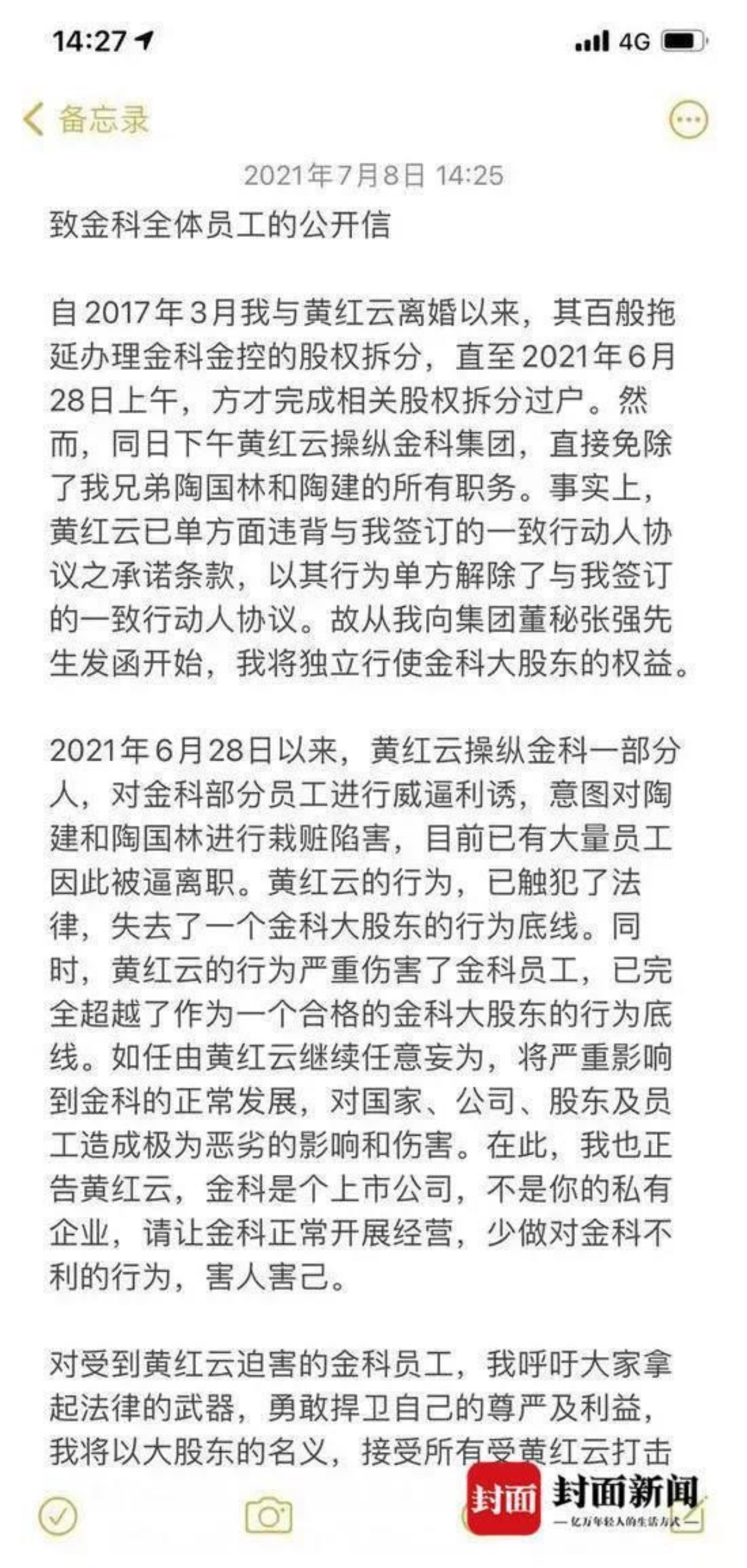然而画风一变,去年7月份出现突发状况。金科股份称在2021年7月陶虹遐以EMS邮政快递的方式给公司董事会秘书张强发来《关于限期发布解除<一致行动协议>的函》,主要内容为:鉴于金科地产集团股份有限公司于2021年6月28日正式发文解除相关人员职务,“该行为系黄红云单方面违背承诺,单方违约解除与本人关于金科股份的《一致行动协议》。现正告张强先生,请找黄红云核实了解情况,并在收到函件后三个工作日内向公众及时披露”。与此同时,网上也流出相关信息。