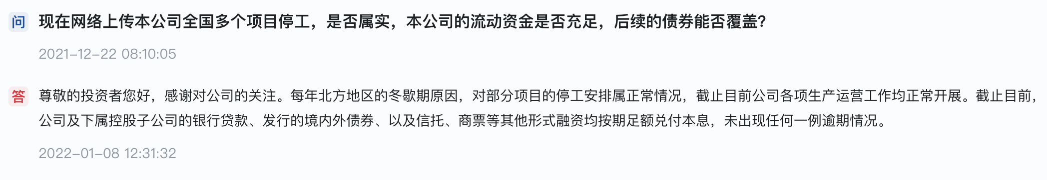 留意金科股份的投资者,应该还听闻了金科股份近月来各种停工的传闻,甚至有投资者跑到了互动平台上提问。金科股份对此的回应表示“属于正常情况”。