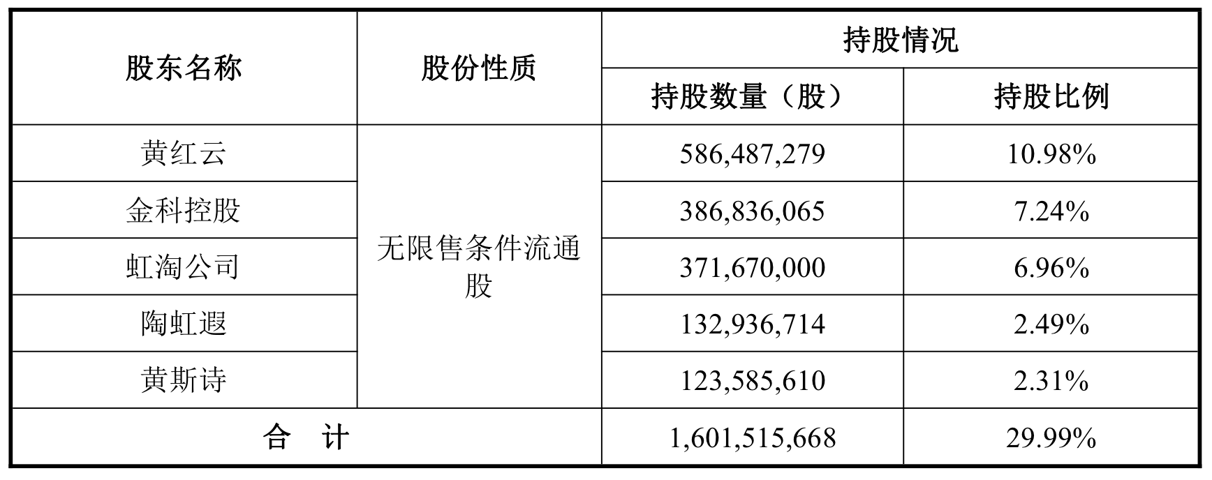 不过数月之后,这事再有变化。2022年1月15日公告,金科股份收到虹淘公司、陶虹遐及黄斯诗的《关于解除一致行动的告知函》及《告知函》,获悉其将不再与黄红云及重庆市金科投资控股(集团)有限公司(下称金科控股)保持一致行动关系。上述一致行动关系解除后,黄红云及其一致行动人合计持有公司股份将降至9.73亿股,占公司总股本的18.22%。不过很快,红星家具集团、广东弘敏补位,与黄红云、金科控股签订了《一致行动协议》,四方合计持股再达15.68亿股,占总股本的29.36%。