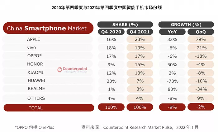 Counterpoint研究分析师Zhang mengmeng表示:“苹果的出色表现是由其定价策略和从华为的溢价基础上获得的混合驱动的。在iPhone 13于去年9月发布后,苹果就上升到中国市场的第一位。之后,在第四季度的大部分时间里,它仍然处于领先位置。”