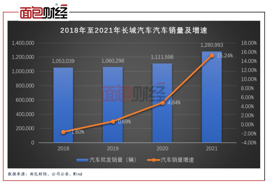 2021年全年,长城汽车实现批发销量128.1万辆,同比增长15.24%,同比增速有较大改善。其中新能源车累计销售13.7万辆,同比增长138.5%,销量占比由上年的5.17%提升至10.7%,在公司所有品牌车型中增速最快。