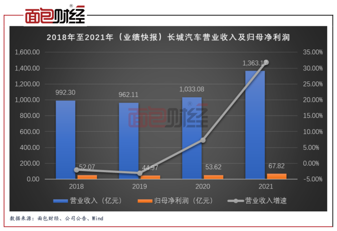 长城汽车2021年实现营业收入1363.17亿元,同比增长31.95%;实现归母净利润67.82亿元,同比增长26.47%;实现扣非归母净利润42.89亿元,同比增长11.8%。