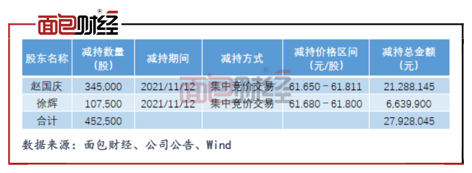 在公司股价创历史新高后,2021年11月12日,公司副总经理赵国庆、董事会秘书徐辉通过集中竞价方式减持公司股份45.25万股,减持总金额逾2792万元。