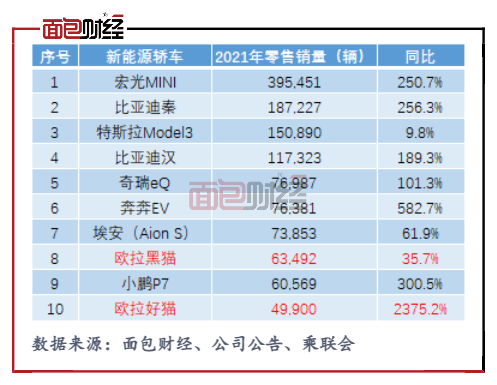 公司新能源品牌欧拉全年实现批发销量13.5万辆,同比增长140%。在乘联会发布的1-12月国内新能源轿车零售销量排行榜中,欧拉黑猫和欧拉好猫分别以6.35万辆、4.99万辆的销量排在第8名、第10名。