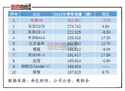 哈弗品牌全年实现批发销量77万辆,同比增长2.64%。在乘联会发布的1-12月国内SUV零售销量排行榜中,哈弗H6车型以35.29万辆的零售销量居榜首,但较上年销量下滑3.2%。