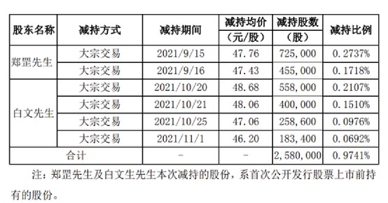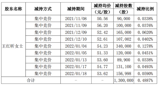 2021年2月18日盘后公告,股东上海联芯以集中竞价方式在2020年12月15日减持16.11万股(减持均价28.22元),2021年1月22日减持5万股(减持均价38.34元)。此外,2020年12月份郑罡通过集中竞价累计减持160万股。