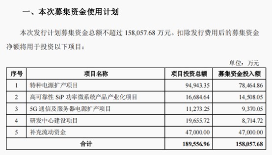 在发布2021年度业绩预告的同时,新雷能还发布了《2022年向特定对象发行A股股票预案》,拟向不超过35名特定对象发行股份,募集15.81亿元。本次募得资金拟投向特种电源扩产项目、5G通信及服务器电源扩产项目、研发中心建设项目以及补充流动资金。在进行产能扩建、加大研发投入力度的同时,加深布局SiP(System In a Package,系统级封装)领域。