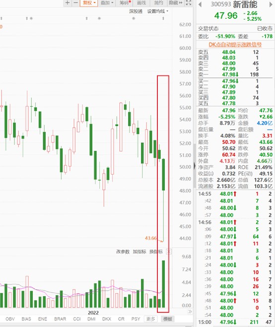 1月28日一早开盘后,新雷能股价出现一次短时间的下跌,最低跌至43.66元(-13.75%),随后反弹至前一日收盘价50.62元,最终收于47.96元,跌5.25%,全天交易量相比于近期出现明显放大。