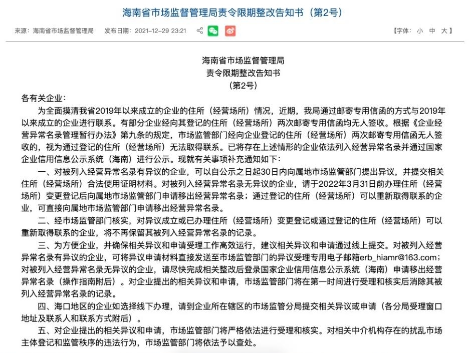 2021年12月20日,海南省市场监督管理局发布《责令期限整改通知书》(以下简称“《通知书》”),要求因”通过登记的住所或者经营场所无法联系”被列入经营异常的企业于2022年1月31日前完成整改并向属地市场监管部门申请移出经营异常名录。部分企业若能“忙上加忙”是件好事,倘若不能“忙上加忙”,逾期不整改的,海南省市场监督管理局将依法予以查处,情节严重的,依法吊销营业执照。